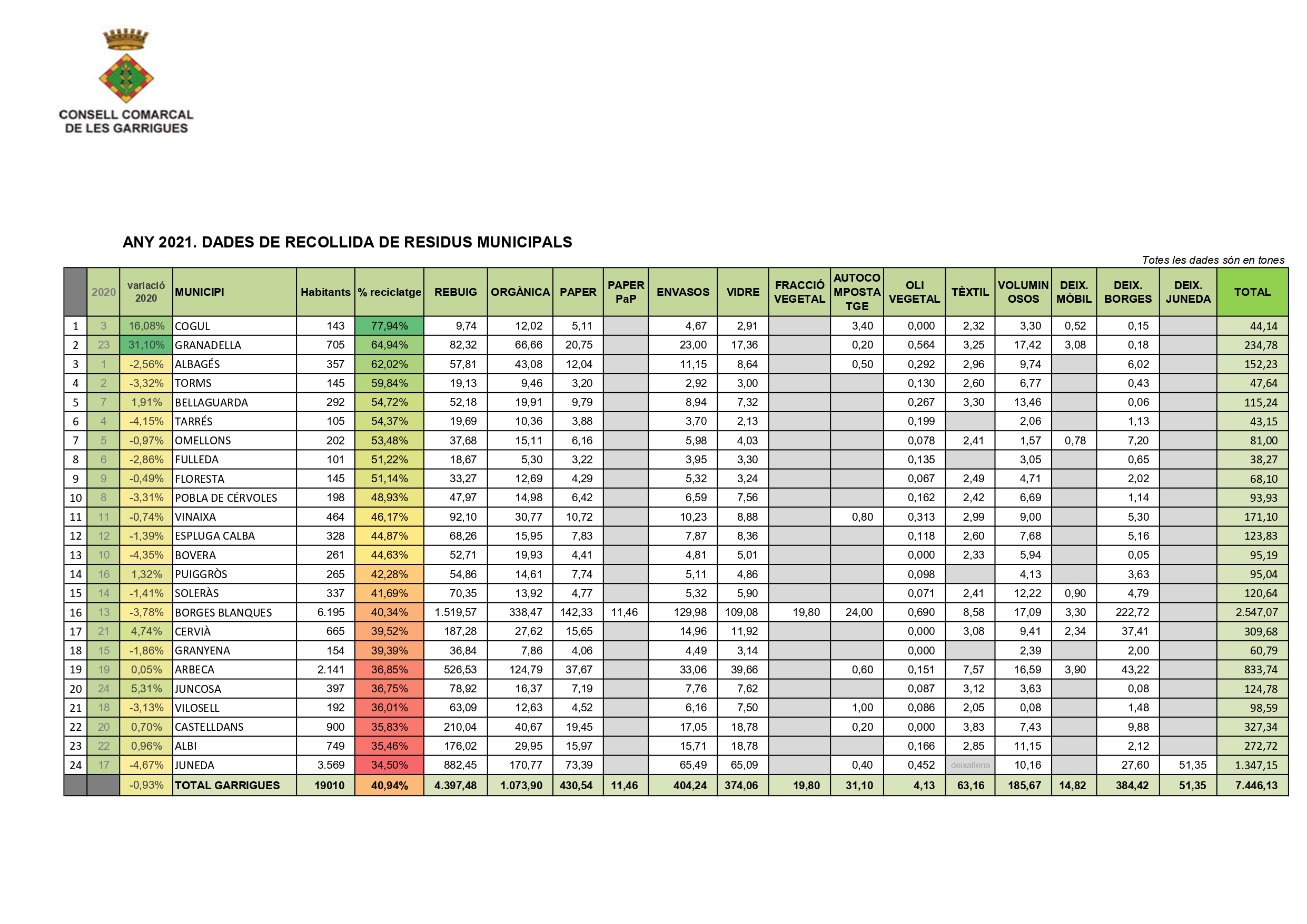 Les dades facilitades pel Consell Comarcal també mostren que el poble baixa en el rànquing del reciclatge i passa de la 4 posició que havia mantingut els anys 2019 i 2020, a la 6 posició de l'any 2021.